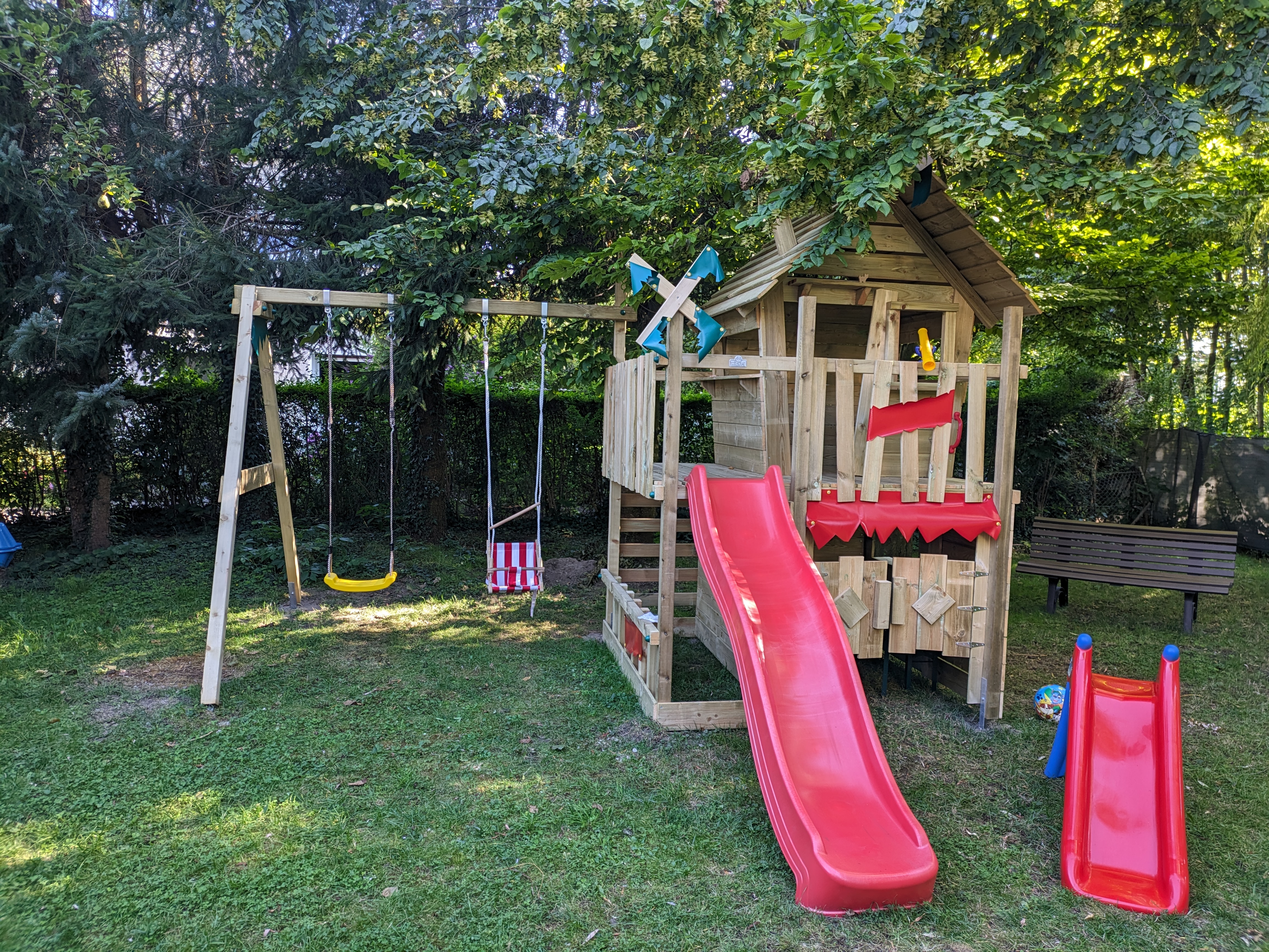 ... toon meerMet ons speeltoestel met huisje wandelen niet alleen eindeloze speelmogelijkheden je tuin in, maar ook een eigen toevluchtsoord voor je kinderen. Het geïntegreerde houten huisje van de Smart Dorado kunnen je kinderen naar hartenlust gezellig maken voor vriendjes en familie en op de onderste etage is genoeg ruimte voor een heuse saloon of een zandkoekjesbakkerij. Aan de fantasie wordt geen grens gesteld. Ook nodigen de dubbele schommel en golfglijbaan (incl. wateraansluiting) uit om te ravotten en kunnen je kinderen hun motoriek doorontwikkelen op de klimmuur. Dit alles maakt onze Smart Dorado de perfecte plek voor onvergetelijke jeugdherinneringen.