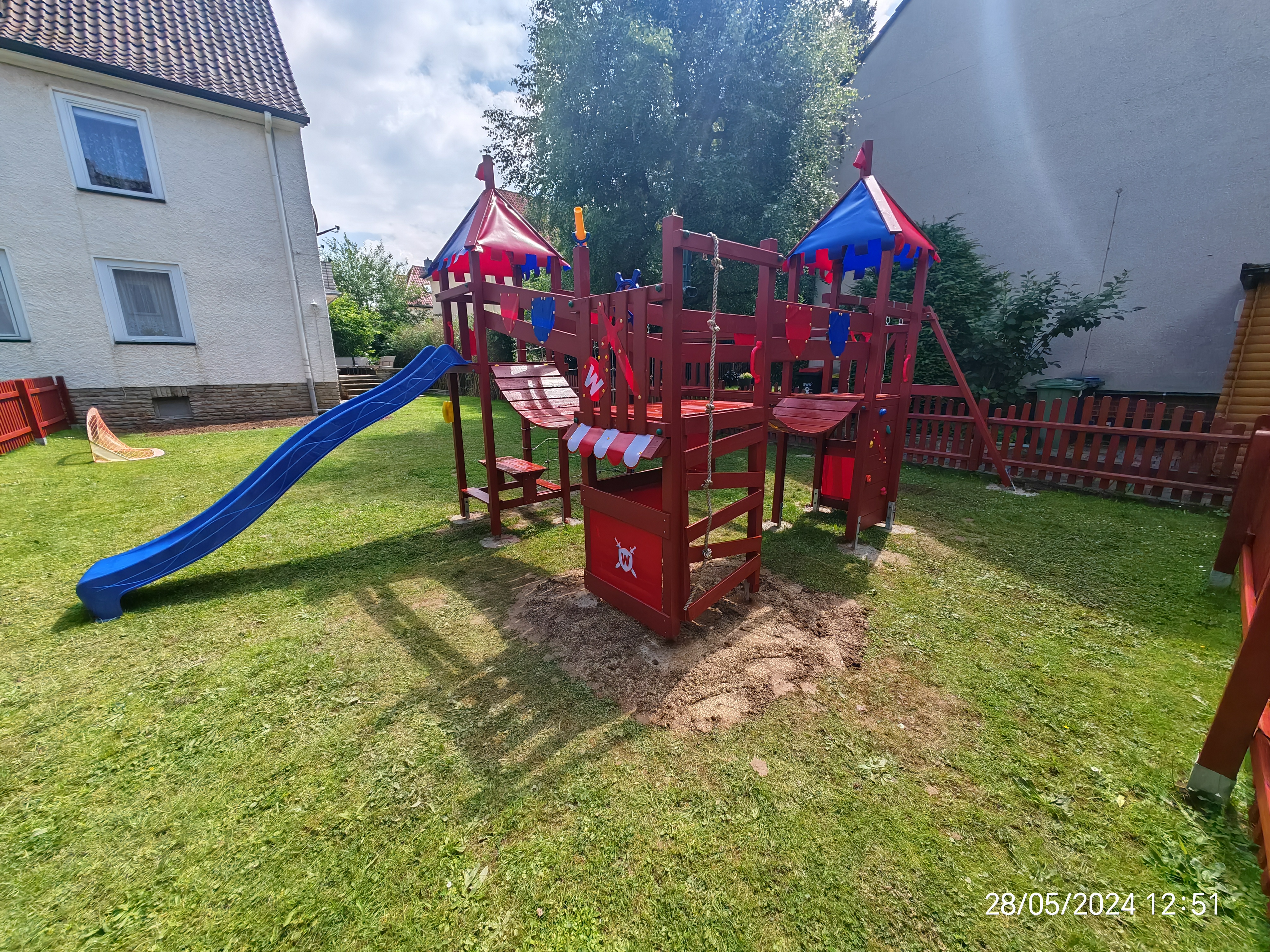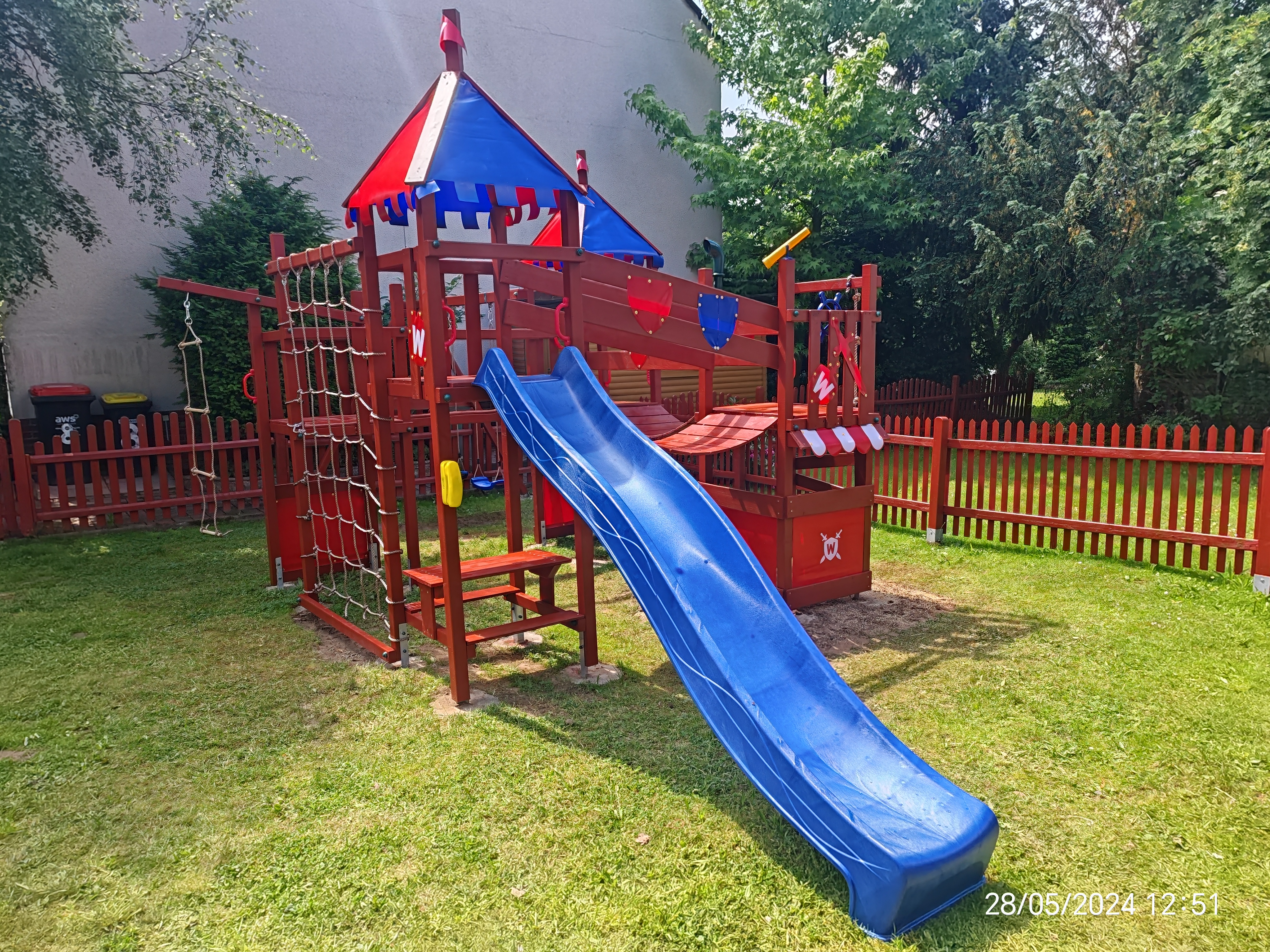 ... toon meerOns majestueuze Smart King kinderspeeltoestel is de ideale aanvulling op je tuin, om creatief spelen te stimuleren. Hij combineert veelzijdige speelelementen, die garant staan voor onvergetelijke jeugdherinneringen in de wereld van prinsessen, kastelen en ridders. Aan de geïntegreerde picknicktafel kunnen je kinderen met hun vriendjes lekker zitten of ze kunnen lekker ravotten op de klimaanbouw. De Smart King beschikt over meerdere platformen en een evenwichtsbalk die deze met elkaar verbindt. Daar kunnen de kleine avonturiers uitstekend hun evenwichtsgevoel trainen. De grote zandbak nodigt uit om te graven en te bouwen, terwijl de authentieke hangbrug de poort naar de eindeloze fantasiewereld van je kinderen opent.